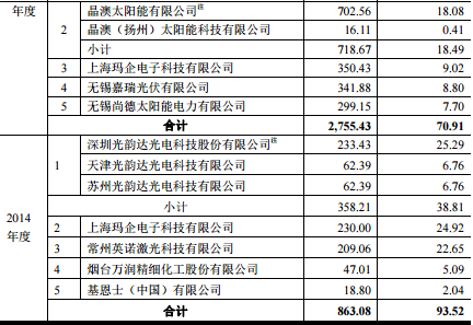 近年来,随着我国拉动内需政策的制定与实施,以及国际市场环境的好转,太阳能电池生产行业发展较快。但受太阳能电池技术更新、市场周期波动、国内外光伏行业政策及贸易政策变化等因素的影响,太阳能电池生产行业能否持续保持平稳增长具有一定不确定性。如太阳能电池生产企业减少设备采购或出现经营风险,可能对公司经营业绩和应收账款回收造成不利影响。2014年至2016年,帝尔激光前五大客户如下所示: