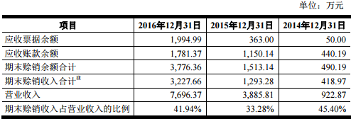 2014年至2016年,帝尔激光的赊销余额为490.19万元、1513.14万元、3776.36万元,占营业收入的比例为45.4%、33.28%、41.94%,呈现出明显的增长趋势。公司应收账款变动情况如下: