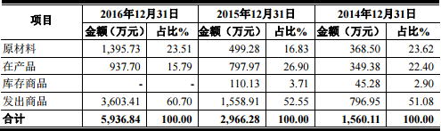 2014年至2016年,帝尔激光的存货余额分别为1560.11万元、2966.28万元及5936.84万元,占同期总资产比例为36.40%、33.43%及36.17%,公司期末存货余额相对较高,且逐年增加。公司存货构成情况见下表: