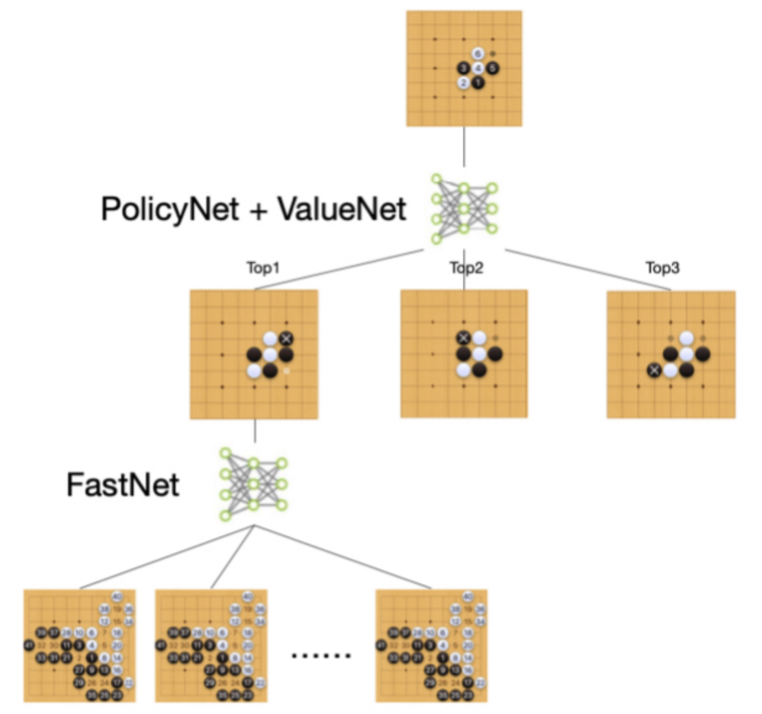 这种方案除了易于想到之外没有其他优点,由于早期模型训练量不大,采用top-n的采样方法会导致AI的招式没有条理,用户很容易诱导出这种落子逻辑的漏洞(如征子)。其次,在对弈过程中,AI模型和落子策略是固定的,但我们在实践中发现,AI对于围棋中的布局、中盘、收官等阶段的招法学习速度并不相同,AI对布局的掌握速度远远超出中盘、收官,使用相同的模型和策略会导致AI在整盘棋的表现差异极大。再者,AI的自对弈训练中,没有定式的概念(定式是围棋高手在某些局部的经验总结,用户学习定式走法可以快速提升棋力),低水平的AI很难在局部中下出最优解,而人可以通过学习高手的棋谱快速掌握局部最佳下法,即使人的水平并没有达到提出该定式的围棋高手水平。上述问题的根源在于AI与人的学习路径大相径庭,难以直接移植。