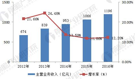 湖北省医药产业2012年-2016年主营业务收入及增幅