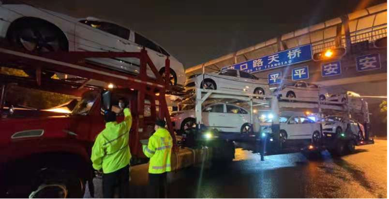 8月15日晚,武汉经济技术开发区东风大道与沌阳大道交汇处执勤卡点,尽管下着雨,却一派繁忙景象。“师傅慢一点,注意安全,请将应急灯打开。”正在此处执勤的交警贺集胜忙着疏导卸货转运车辆安全有序停放。