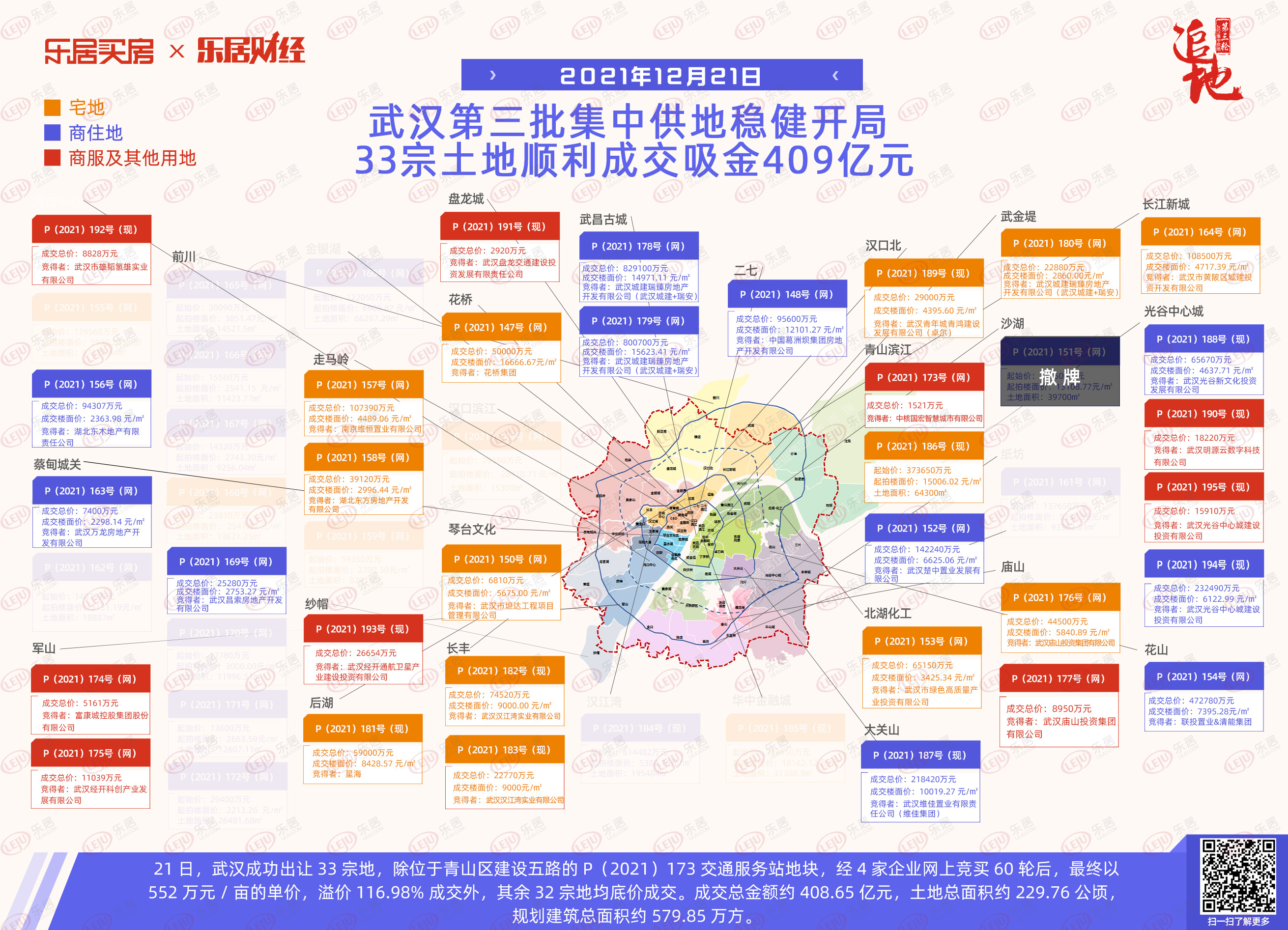 12月21日,武汉第三轮“两集中”开拍,根据武汉土地市场网最新公告,部分地块摘牌时间调整。21日,武汉实际出让33宗地,起拍金408.57亿起。最终,33宗除位于青山区建设五路的P(2021)173交通服务站地块,经4家企业网上竞买60轮后,最终以552万元/亩的单价,溢价116.98%成交外,其余32宗地均底价成交。成交总金额约408.65亿元,土地总面积约229.76公顷,规划建筑总面积约579.85万方。