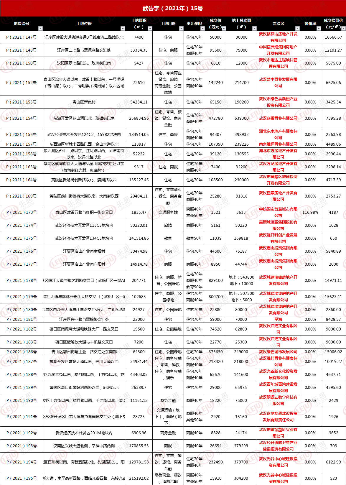 P(2021)147号地块,由武汉格律诗房地产开发有限公司(花桥集团)以底价50000万元竞得,楼面地价16666.67元/㎡,溢价率0%。
